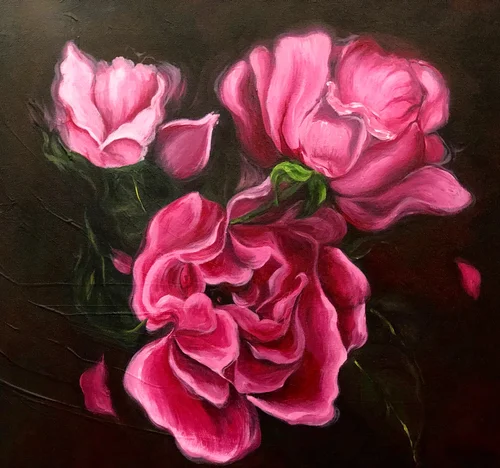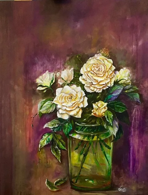This painting is a unique stylization of the simple idea of a still life as it transforms the brush strokes into complex relief structures. ‘Roses’ originally made as a gift to my grandmother is a confluence of the traditional and the modern. In this juxtaposition the painting acts as a representation of my relationship with my grandmother.