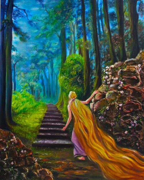 In the composition the girl is inspired from ‘Rapunzel’ a princess who was know for her telltale flowing golden hair. But we see her in a new light. She has a staircase of possibilities in front of her leading her to where ever she wants to go. If she has the determination and the drive to excel nothing can stop her. The hazy nature of the wilderness is a depiction of how her choices may not always be right and that the path itself is not an easy walk but it will always be hers to embrace.